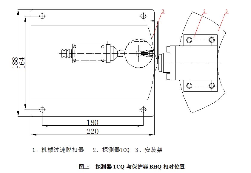 3、安裝過速保護器BHQ(由業(yè)主自己根據(jù)現(xiàn)場情況配裝,應(yīng)有足夠的空間供保護器完成手動復(fù)位)及過速保護器BHQ的安裝螺栓不能完全緊固,以便于后面調(diào)整,安裝時要求液壓閥中心高度與過速探測器在同一高度,同時脫扣裝置的一邊與主軸中心線重合(如圖三),然后鎖緊螺栓。