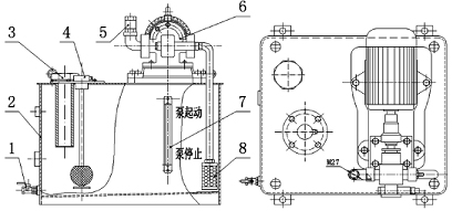 5、出油口        6、齒輪油泵       7、液位計(jì)        8、濾油器
